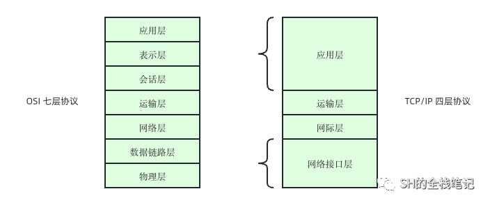 相对于 OSI 的不实用,TCP/IP 是一个四层的体系结构,分别是:应用层、运输层、网际层、网络接口层,和 OSI 的对比如下图所示: