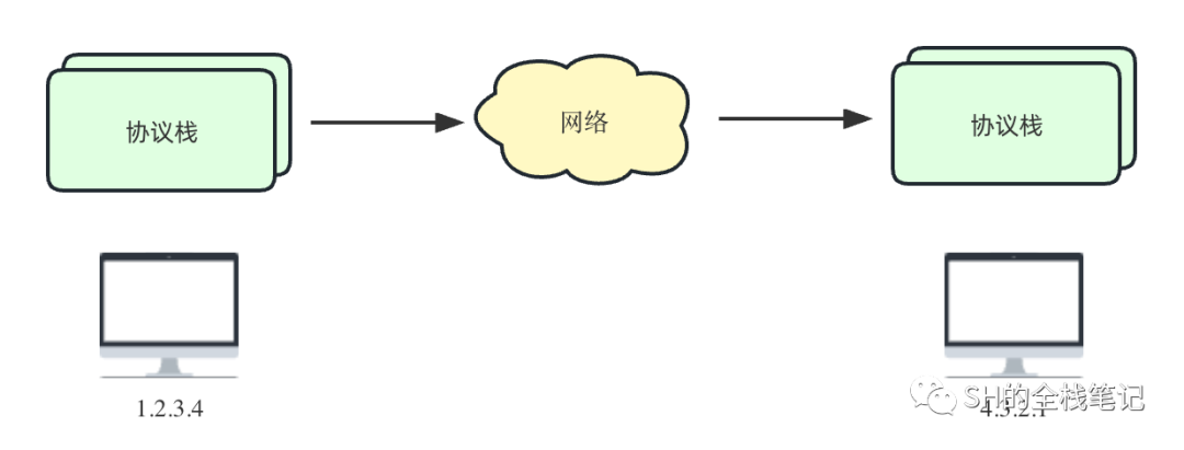 1.2.3.4 发送的数据,会经过协议栈从上至下的处理,变成一个一个的数据包,然后 4.3.2.1 收到数据包之后,也会经过协议栈从下至上的处理,解析出原始的消息。