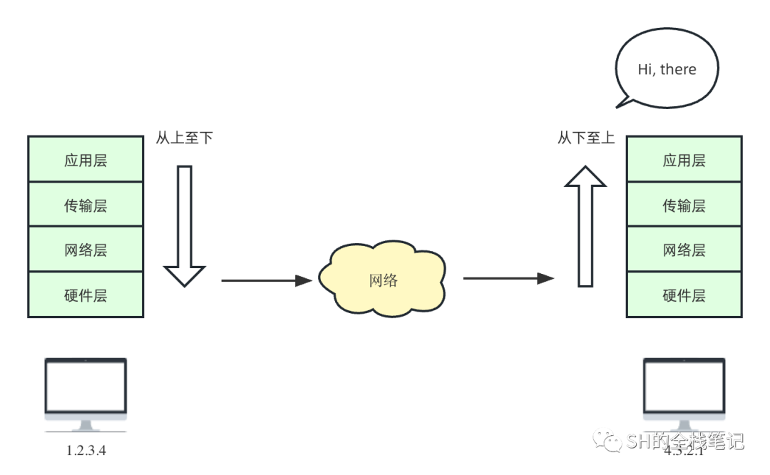 这个流程跟上面举过的网购、快递包裹的例子非常类似,我们下单了东西,卖家会将东西层层的包装,而这个“打包”的过程跟协议栈对数据包的处理非常像,从上至下,将数据「Hi, there」一步步的处理。而对于我们收快递的人来说,我们会一点点从外至里的打开这个包裹,最终拿到我们购买的货物。而对于 4.3.2.1 的协议栈来说,一步步的将电信号还原成「Hi, there」也是同样的道理。