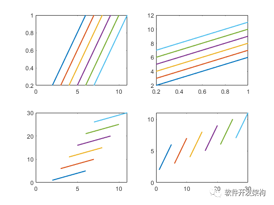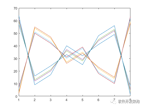 语句说明:对矩阵A绘制向量x的图形。对于一个m×n的矩阵A和一个长度为m的向量x,对矩阵A的列绘制向量x的图形;如果x的长度为n,则对矩阵A的行绘制向量x的图形。向量x可以是行向量,也可以是列向量。