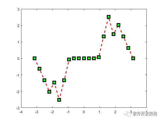plot(x, y, '--rs', 'LineWidth', 2, 'MarkerEdgeColor', 'k', 'MarkerFaceColor', 'g', 'MarkerSize', 10);