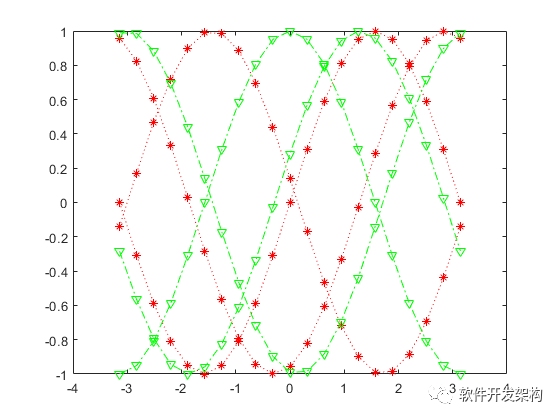 语句说明:用字符串str1指定的颜色和线型对y1绘制x1的图形,用字符串str2指定的颜色和线型对y2绘制x2的图形……每组参数值可以采用上述除复数值外的任何一种形式。str1,str2…可以省略,此时,MATLAB自动为每条曲线选择颜色和线型。