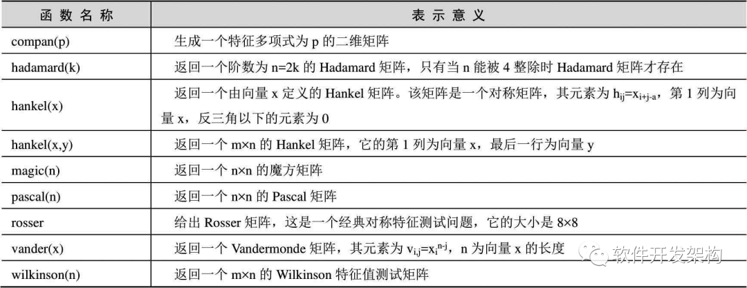 除了在之前章节提到的零矩阵、单位矩阵和全1矩阵等特殊矩阵,MATLAB中还有一些指令用于生成试验矩阵。表3-1给出了MATLAB中其他特殊矩阵的指令集。