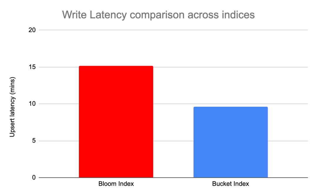 • upsert(第二次提交)比较 bloom 索引和桶索引的总写入延迟。