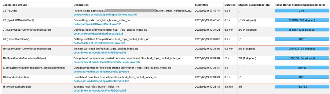 如下是两者的 Spark UI。使用桶索引可以明显地看到索引查找不涉及任何阶段,而对于 Bloom 索引可以看到其中有几个阶段/作业用于索引标记。Bloom索引 Spark UI