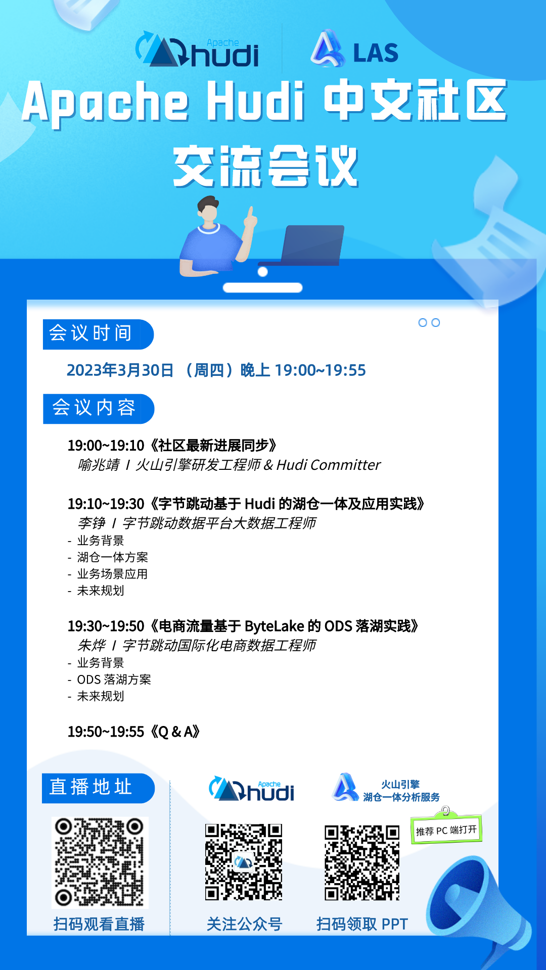 Apache Hudi 中文社区技术交流会第九期将在北京时间 2023.3.30(本周四)晚上 19:00 ~ 19:55 线上开播 。会议由火山引擎湖仓一体分析服务 LAS 团队主办,围绕 Apache Hudi 社区最新进展、应用实践等交流探讨。本次会议将由 火山引擎研发工程师 & Hudi Committer 喻兆靖 为大家讲解《社区最新进展同步》,紧接着由 字节跳动数据平台大数据工程师 李铮 为大家分享 《字节跳动基于 Hudi 的湖仓一体及应用实践》,最后由 字节跳动国际化电商数据工程师 朱烨 为大家揭秘《电商流量基于 ByteLake 的 ODS 落湖实践》。