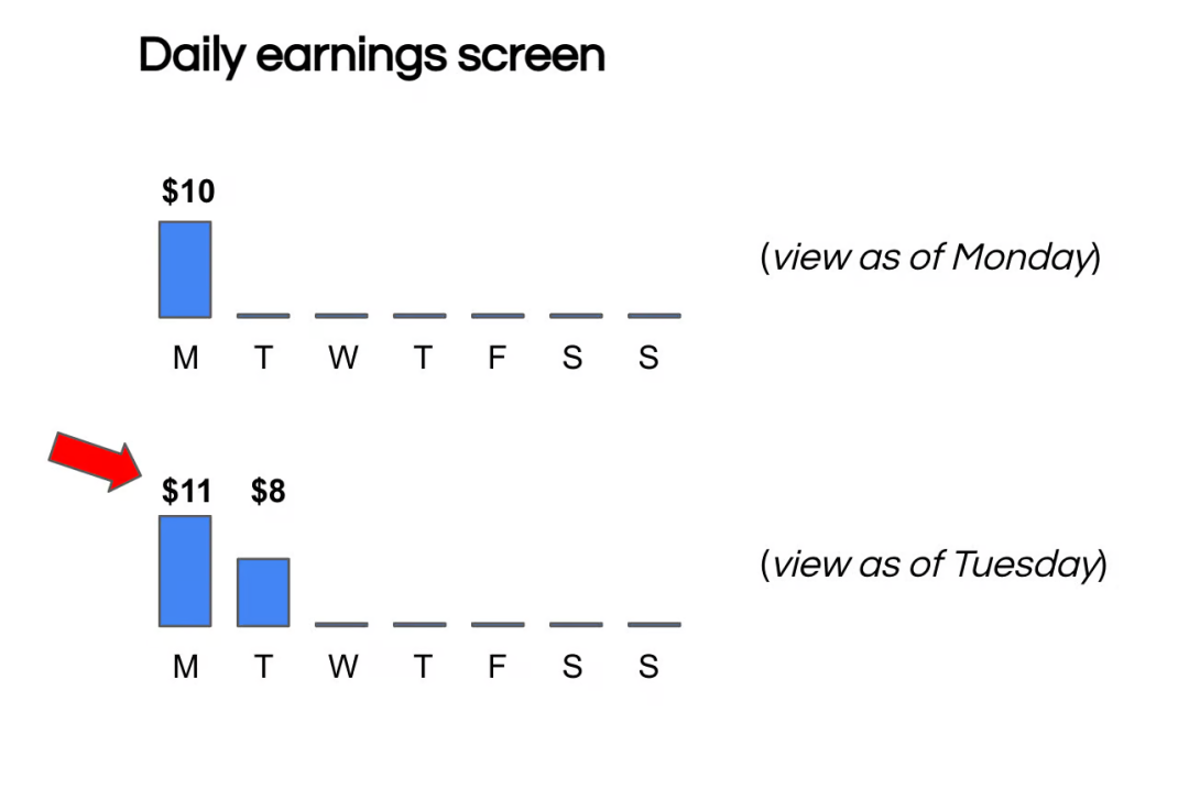 让我们举一个非常重要的例子,增量读写可以带来比传统批处理数据处理显着的性能提升。假设数据集包含每个司机每天的司机收入。有时乘客可以选择在行程结束数小时后给司机小费,这将是对包含基本收入信息的初始记录的延迟更新。下面的图 2 详细说明了特定司机是如何发生这种情况的,他在周一的行程中赚了 10 美元,并在周二早上的周一行程中获得了 1 美元的小费。