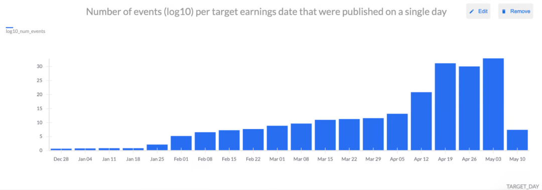 在典型的批处理 ETL 世界中,我们不知道输入数据是如何变化的。我们将假设“N”天回顾(基于操作启发式)并重新处理所有分区,在必要时将司机收入更新到目标表。事实证明,这是一个非常耗费时间和资源的过程,因为在几个月前的分区中可能只有非常少量的记录需要更新。在下图中可以看到在一次运行中触及的所有日期分区,以及需要为该特定日期更新的事件数。