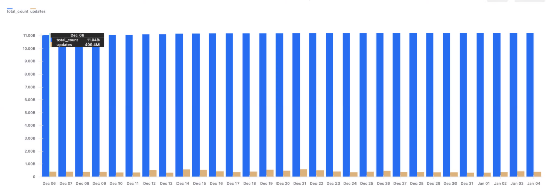 迎合此用例的批处理方法是一次提取一整天的更改,然后将其与每个现有记录的最新状态合并,以获取所有实体的最新图片,然后使用此信息填充所有其他表 . 如上图(图 4)所示,每天进入的实体更新百分比占实体总数的很大一部分(4.08 亿增量变化与 110 亿实体总数相比)。批处理方法的问题是计算是在数据被认为是完整的之后完成的,并增加了所有下游表的 SLA。由于涉及大量数据,管道需要大约 14 小时才能完成,因此一次故障将再次使 SLA 增加许多小时。在增量 ETL 方法中,由于能够运行更频繁、更短的管道运行,故障对数据新鲜度 SLA 的影响大大降低。
