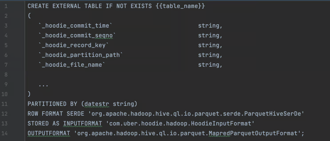 一个 DDL 定义文件,其中包含预期数据集的架构信息,并将表的格式声明为 Apache Hudi 格式。可以在下图中看到示例 DDL 文件: