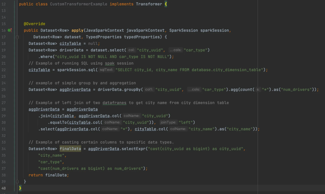 对于更高级的用户,除了 SQL 文件之外,还可以选择提供自定义的基于 Scala/Java Apache Spark RDD 的转换器,该转换器将在运行时由 DeltaStreamer 执行。为此只需实施位于 Apache Hudi Utilities Bundle 中的转换器接口。下图中可以看到一个简单的自定义转换类,它转换维度驱动表中的增量数据并连接维度城市表: