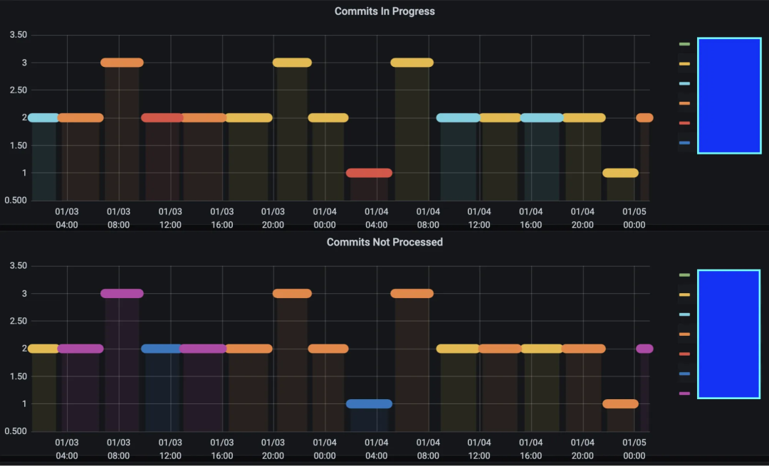 下图显示了正在进行的提交与已处理的提交,这将告诉我们上游和下游管道之间的滞后,以及增量 ETL 管道处理的源表中生成的每个提交之间的滞后。当增量 ETL 出现故障时,将向我们的值班人员发送警报。