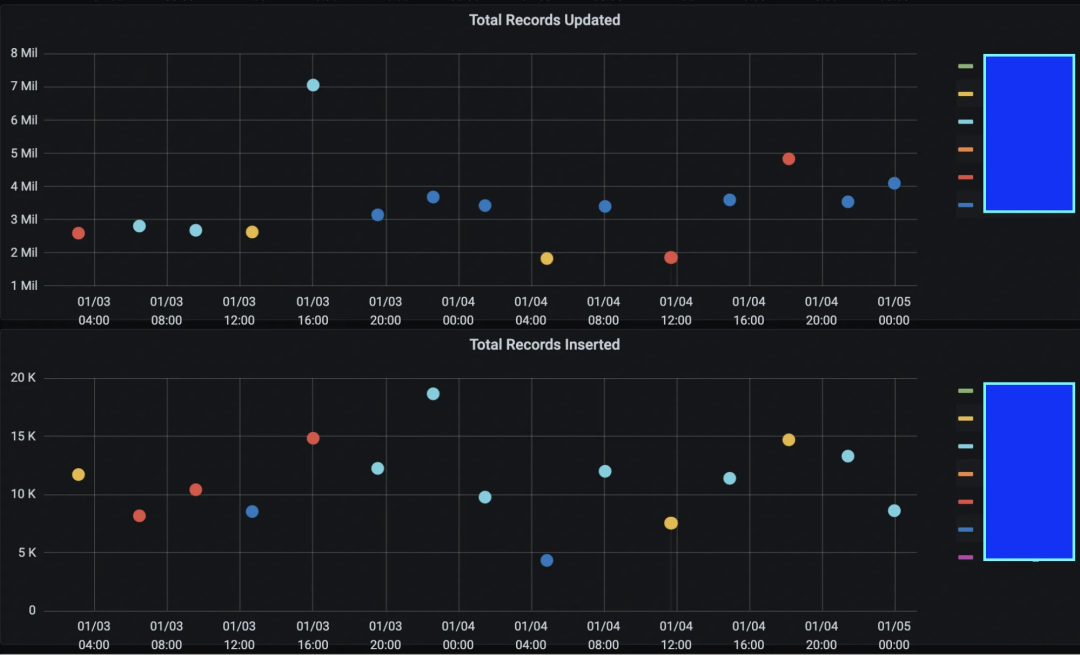 Apache Hudi 的 DeltaStreamer 有多个关键指标[10],这些指标将提供有关 ETL 执行中发生的事情的详细见解,例如正在进行的提交数量、完成的提交、插入/更新/删除的总记录等。下面的 Grafana 仪表板显示了几个示例 在 DeltaStreamer 中捕获的指标。这些指标在设置监控和警报系统以立即了解 ETL 管道何时落后于其上游源时非常有用。