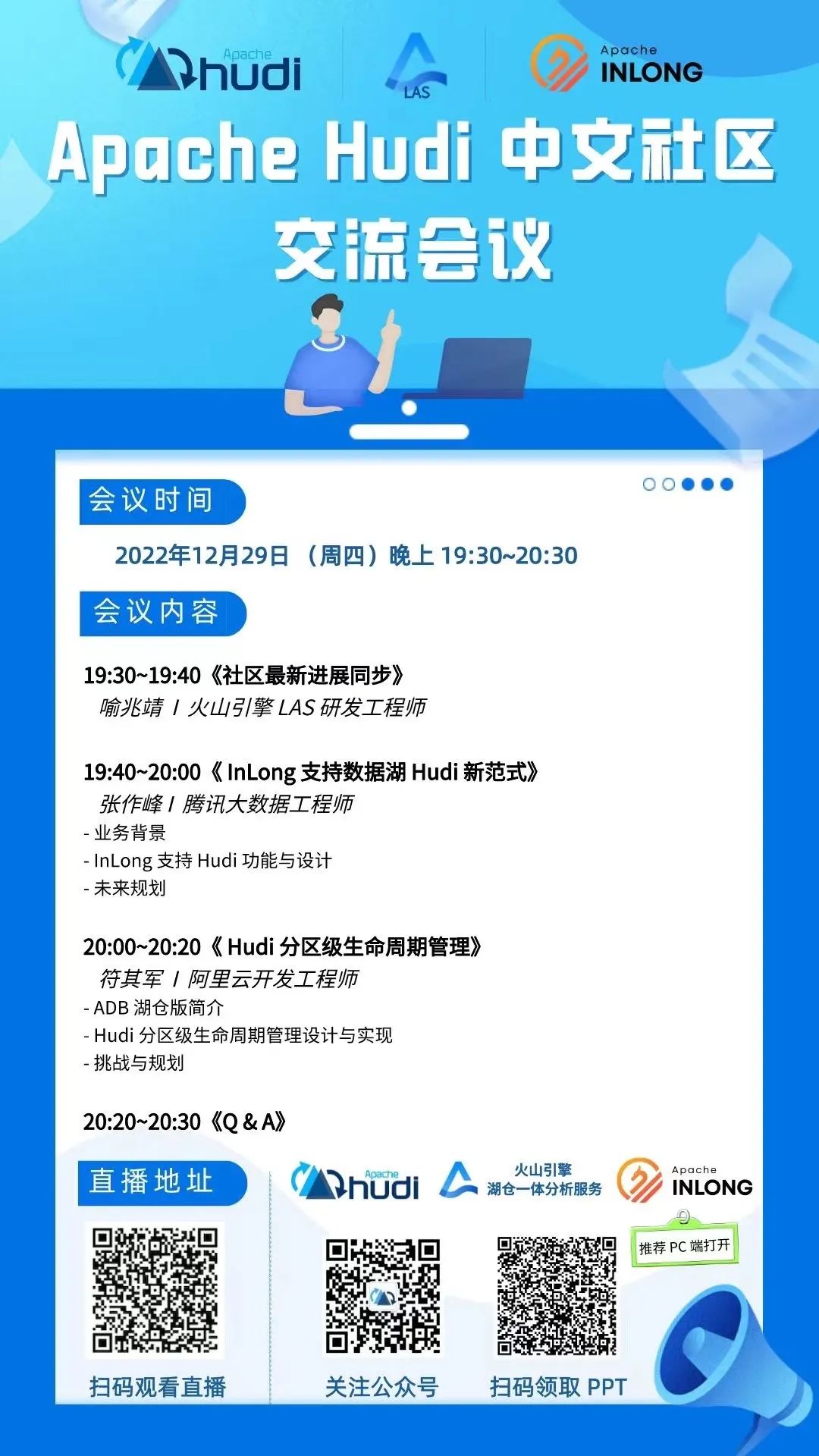 Apache Hudi 中文社区技术交流会第七期将在北京时间 2022.12.29(本周四)晚上 19:30 ~ 20:30 线上开播。会议由火山引擎湖仓一体分析服务 LAS 团队主办,围绕 Apache Hudi 社区最新进展、技术实践等互换想法。本次会议将由 火山引擎 LAS 研发工程师 喻兆靖 为大家讲解《社区最新进展同步》,紧接着由 Apache InLong 和 Apache Hudi Contributor 张作峰 为大家分享 《InLong 支持数据湖 Hudi 新范式》,最后由 阿里云开发工程师 符其军 为大家揭秘《Hudi 分区级生命周期管理》 。