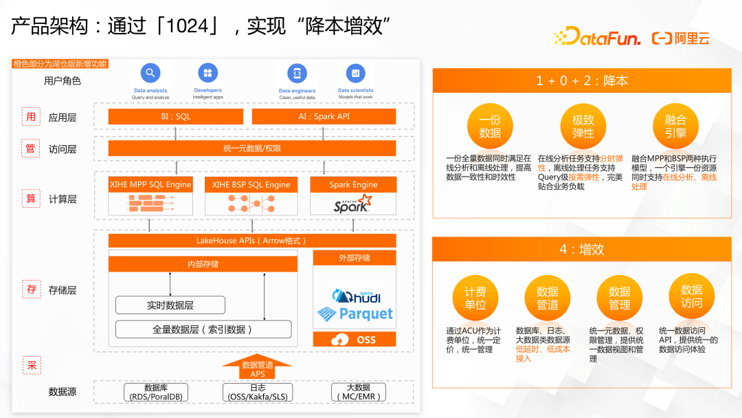 一体版本,我们称为 ADB 湖仓版。湖仓版在数据全链路的「采存算管用」5 大方面都进行了全面升级。在「采集」方面,我们推出了数据管道 APS 功能,可以一键低成本接入数据库、日志、大数据中的数据。在「存储」方面,我们除了新增 Hudi 格式的外表能力,也对内部存储进行了升级改造。通过只存一份数据,同时满足离线、在线 2 类场景。在「计算」方面,我们对自研的 XIHE BSP SQL 引擎进行容错性、运维能力等方面的提升,同时引入开源 Spark 引擎满足更复杂的离线处理场景和机器学习场景。在「管理」方面,我们推出了统一的元数据管理服务,统一湖仓元数据及权限,让湖仓数据的流通更顺畅在「应用」方面,除了通过SQL方式的BI分析应用外,还支持基于 Spark 的 AI 应用。我们希望通过资源一体化和体验一体化,2 个一体化能力,帮助客户实现降本增效。资源一体化是指一份数据、极致弹性和融合引擎。体验一体化是指统一的计费单位、数据管道、数据管理和数据访问。