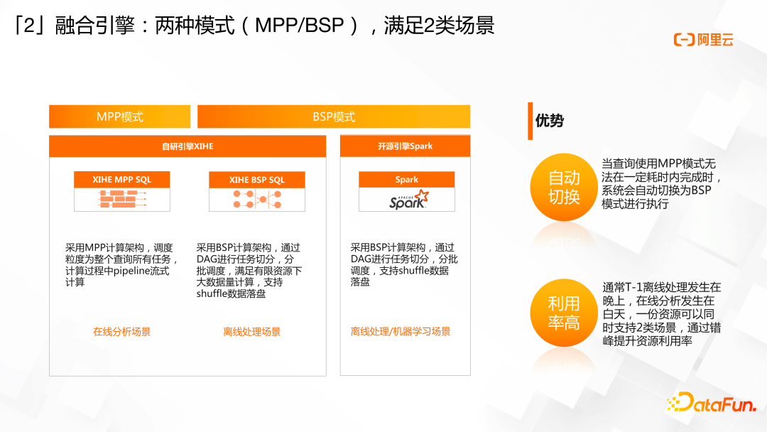 支撑离线、在线两类场景的背后,除了刚才提到的一份数据。还有自研的XIHE融合计算引擎,同时提供 MPP 模式和 BSP 模式,并提供自动切换能力。自动切换能力是指当查询使用 MPP 模式无法在一定耗时内完成时,系统会自动切换为 BSP模式进行执行。未来,我们还将在一个查询中,根据算子特点部分算子采用 MPP 模式,部分算子采用 BSP 模式,兼顾高性能和高吞吐,提供更智能的查询体验。同时融合引擎为提供资源利用率提供了可能,通常离线处理发生在晚上,在线分析发生在白天,一份资源可以同时支持 2 类场景,通过错峰提升资源利用率。