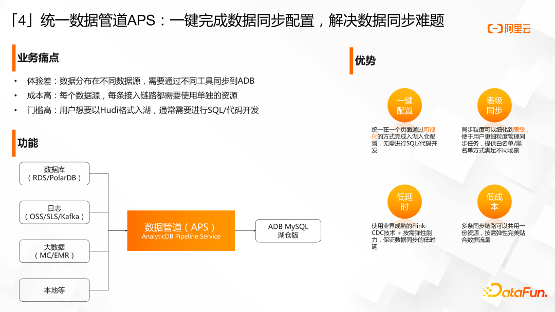 前面也提到 ADB 湖仓版拥抱开源技术,ADB 集成了流式处理引擎 Flink,并在此基础上推出了 APS 数据管道服务,APS 具备如下优势:1.低成本,低延迟:作业级别弹性资源,按量付费;按流量自由设定作业资源;充分享受 Flink 流式处理性能红利2.多数据源快速集成:得益于 Flink 成熟的 Connectors 机制,可以方便对接如 SLS、Kafka 等数据源,同时可以保证数据入湖的精确一致性3.低使用门槛:支持白屏化操作快速构建 Lakehouse,基于统一元数据服务,Lakehouse 数据可通过 Spark/ADB 引擎无缝访问