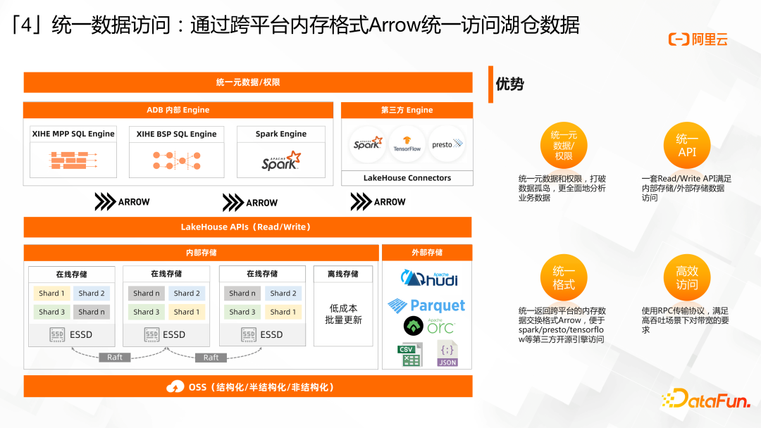 对于湖仓中的表元数据,ADB 做了统一元数据服务,湖仓中的元数据/权限可互通,可通过不同引擎自由访问湖仓数据;而对于湖仓数据,为了屏蔽底层数据存储格式的差异,便于第三方引擎集成,ADB 提供了面向内存列存格式 Arrow,满足对吞吐的要求,对于内部存储,已经通过 Arrow 格式完成 Spark 对接,提供高吞吐能力。