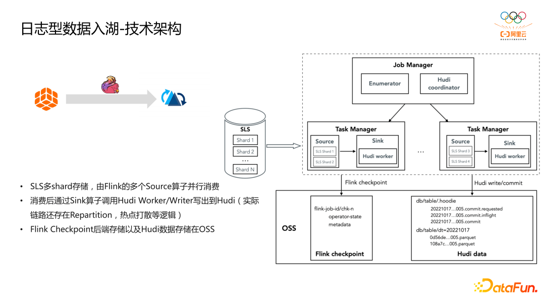先来看下日志数据入湖的技术架构,数据从 SLS 读取,然后通过 Flink 写入 Hudi,整个架构非常简单,其中对于 SLS 和 Flink 的状态存储说明如下:1.SLS 多 Shard 存储,由 Flink 的多个 Source 算子并行消费2.消费后通过 Sink 算子调用 Hudi Worker/Writer 写出到 Hudi(实际链路还存在 Repartition,热点打散等逻辑)3.Flink Checkpoint 后端存储以及 Hudi 数据存储在OSS