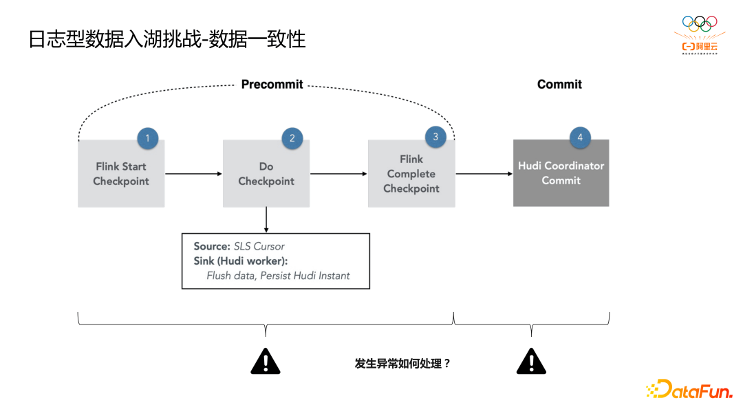 1.其中步骤 1 到 3 之间是 Flink Checkpoint 逻辑,如果异常在这些步骤上发生,则认为 Checkpoint失败,触发 Job 重启,从上一次 Checkpoint 恢复,相当于两阶段提交的 Precommit 阶段失败,事务回滚,如果有 Hudi 的 inflight commit,等待 Hudi Rollback 即可,无数据不一致问题2.当 3 到 4 之间发生异常,则出现 Flink 和 Hudi 状态不一致。此时 Flink 认为 Checkpoint 已结束,而 Hudi 实际尚未提交。如果对此情况不做处理,则发生了数据丢失,因为Flink Checkpoint 完毕后,SLS 位点已经前移,而这部分数据在 Hudi 上并未完成提交,因此容错的重点是如何处理此阶段引起的数据一致性问题3.我们拿一个例子举例分析在步骤 3 和 4 之前发生异常时,如果保证数据一致性4.否则认为上一次 Instant 执行失败,等待 Rollback 即可,脏数据对用户不可见