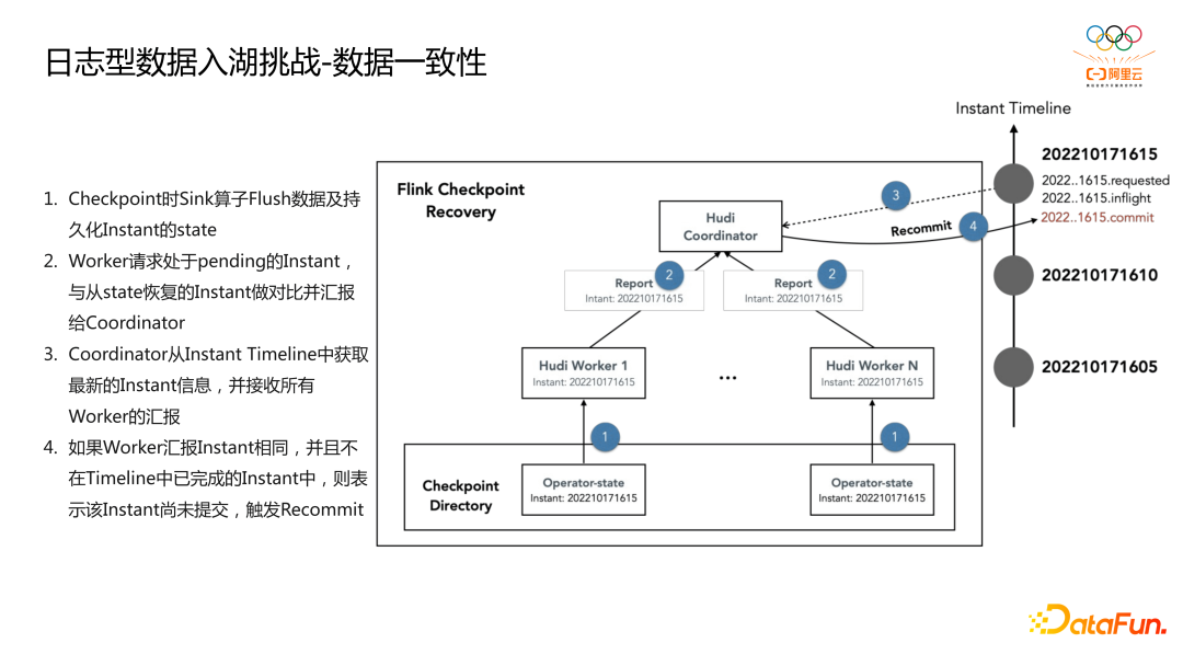 我们举例分析下在步骤 3 和 4 之间发生异常时,是如何保证数据一致性的,可以看到对于1615 的 commit 在 Flink 完成 Checkpoint 时会将其 instant 信息持久化至 Flink 后端存储。1.Checkpoint 时 Sink 算子 Flush 数据及持久化 Instant 的 state;2.Worker 请求处于 pending 的 Instant,与从 state 恢复的 Instant 做对比并汇报给 Coordinator;3.Coordinator 从 Instant Timeline 中获取最新的 Instant 信息,并接收所有 Worker 的汇报;4.如果 Worker 汇报 Instant 相同,并且不在 Timeline 中已完成的 Instant 中,则表示该 Instant 尚未提交,触发 Recommit。经过上述步骤可以保证在 Flink 完成 Checkpoint 时,但对于 Hudi Commit 失败时的场景会进行 recommit,从而保证数据的一致性。