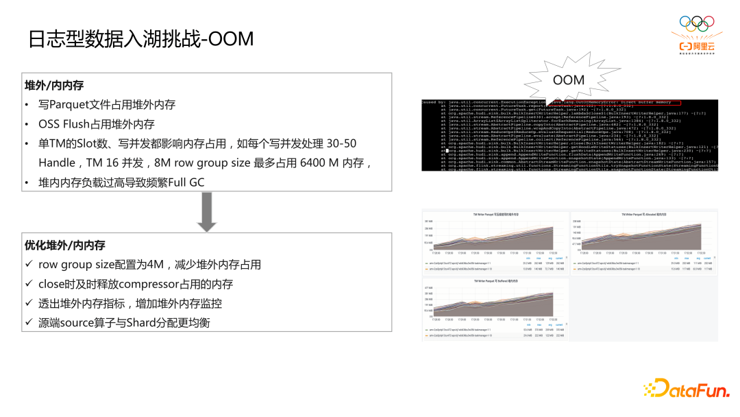 另外一个挑战是 OOM,其实和热点打散也有很大关系,我们发现作业运行时会出现OOM,导致作业挂掉,数据延迟上涨,因此我们对堆外/堆内内存的使用做了比较细致的梳理,使用内存的部分主要集中在:3.单 TM 的 Slot 数、写并发都影响内存占用,如每个写并发处理 30-50 Handle,TM 16 并发,8M row group size 最多占用 6400 M 内存1.row group size 配置为 4M,减少堆外内存占用,同时将堆外内存调大2.close 时及时释放 compressor 占用的内存,这部分对 parquet 源码做了改造3.透出堆外内存指标,增加堆外内存监控,这部分也是对 parquet 源码做了改造4.源端 source 算子与 Shard 分配更均衡,以此保证各 TM 消费的 shard 数基本均等