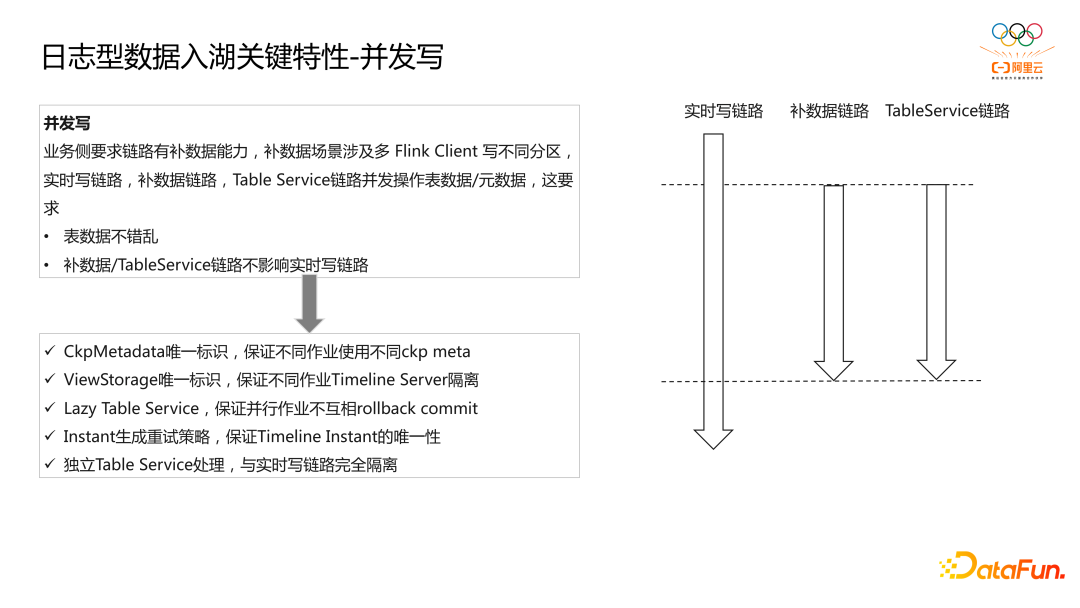 首先是支持并发写,业务侧要求链路有补数据能力,补数据场景涉及多 Flink Client 写不同分区,实时写链路,补数据链路,Table Service 链路并发操作表数据/元数据,这要求:2.补数据/TableService 链路不影响实时写链路因此我们对 Hudi 内核侧做了部分修改来支持并发写场景:1.CkpMetadata 唯一标识,保证不同作业使用不同 ckp meta2.ViewStorage 唯一标识,保证不同作业 Timeline Server 隔离3.Lazy Table Service,保证并行作业不互相 rollback commit,避免数据错乱4.Instant 生成重试策略,保证 Timeline Instant 的唯一性,避免数据错乱5.独立 Table Service 处理,使用单独的作业运行 Table Service,与实时写链路完全隔离
