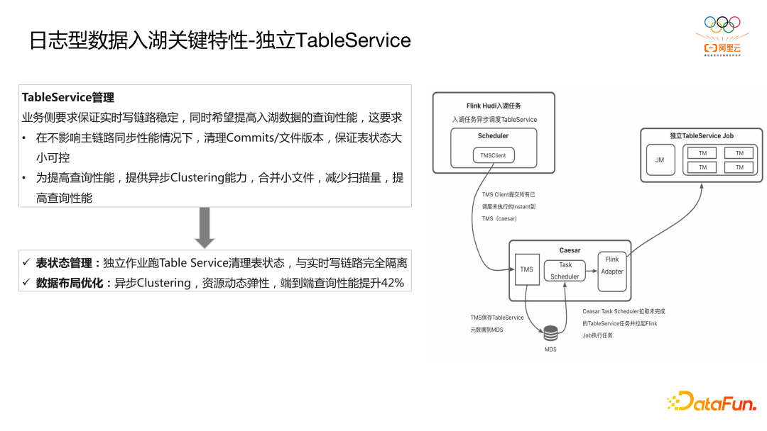 最后一个比较大的关键特性是独立 TableService,业务侧要求保证实时写链路稳定,同时希望提高入湖数据的查询性能,这要求:1.在不影响主链路同步性能情况下,清理 Commits/文件版本,保证表状态大小可控2.为提高查询性能,提供异步 Clustering 能力,合并小文件,减少扫描量,提高查询性能基于上述诉求我们开发了基于 ADB 湖仓版的独立 Table Service 服务,在入湖链路写入完成后会进行一次调度,然后将请求写入调度组件,供调度组件后续拉起弹性的 Flink/Spark TableService 作业,可以做到对实时写入链路无影响。对于表状态管理以及数据布局优化均是采用的独立 TableService 作业执行,保证表的状态大小可控,同时通过异步 Clustering 操作,端到端查询性能提升 40% 以上。