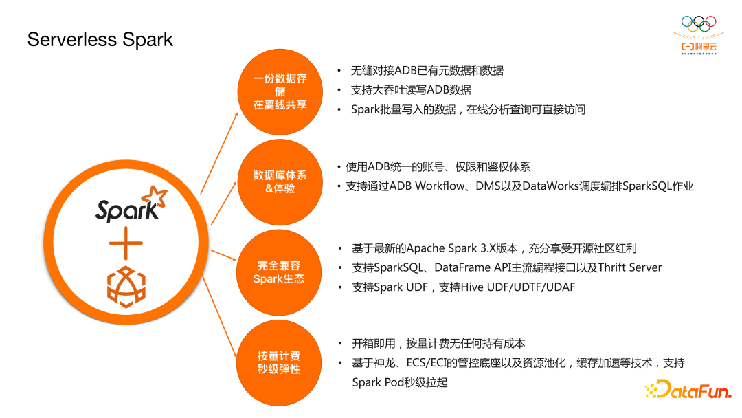 而为了满足客户对于批处理以及机器学习能力的诉求,ADB 集成了 Spark 引擎,并在此技术上推出了 Servlersss Spark,其具备如下优势:1.一份数据存储,在离线共享:无缝对接 ADB 已有元数据和数据;支持大吞吐读写 ADB 数据;Spark 批量写入的数据,在线分析查询可直接访问2.数据库体系&体验:使用 ADB 统一的账号、权限和鉴权体系;支持通过 ADB Workflow、DMS 以及 DataWorks 调度编排 SparkSQL 作业3.完全兼容 Spark 生态:基于最新的 Apache Spark 3.X 版本,充分享受开源社区红利;支持 SparkSQL、DataFrame API 主流编程接口以及 Thrift Server;支持 Spark UDF,支持 Hive UDF/UDTF/UDAF4.按量计费,秒级弹性:开箱即用,按量计费无任何持有成本;基于神龙、ECS/ECI 的管控底座以及资源池化,缓存加速等技术,支持 Spark Pod 秒级拉起