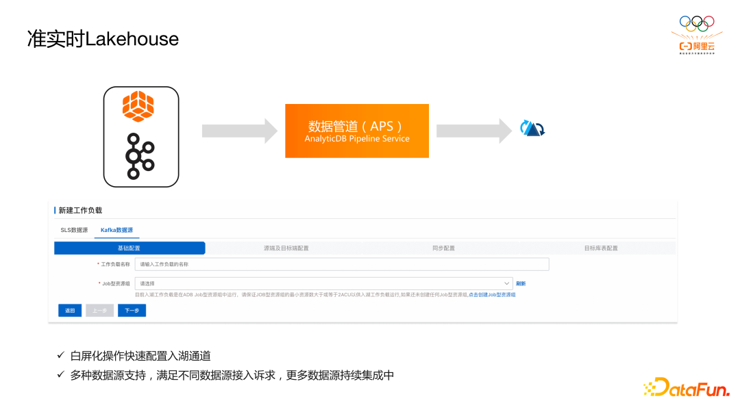对于实时性有诉求的场景,可以基于 ADB APS 服务非常方便的构建准实时 Lakehouse,白屏化操作快速配置入湖通道,多种数据源支持,满足不同数据源接入诉求,更多数据源也在持续集成中。