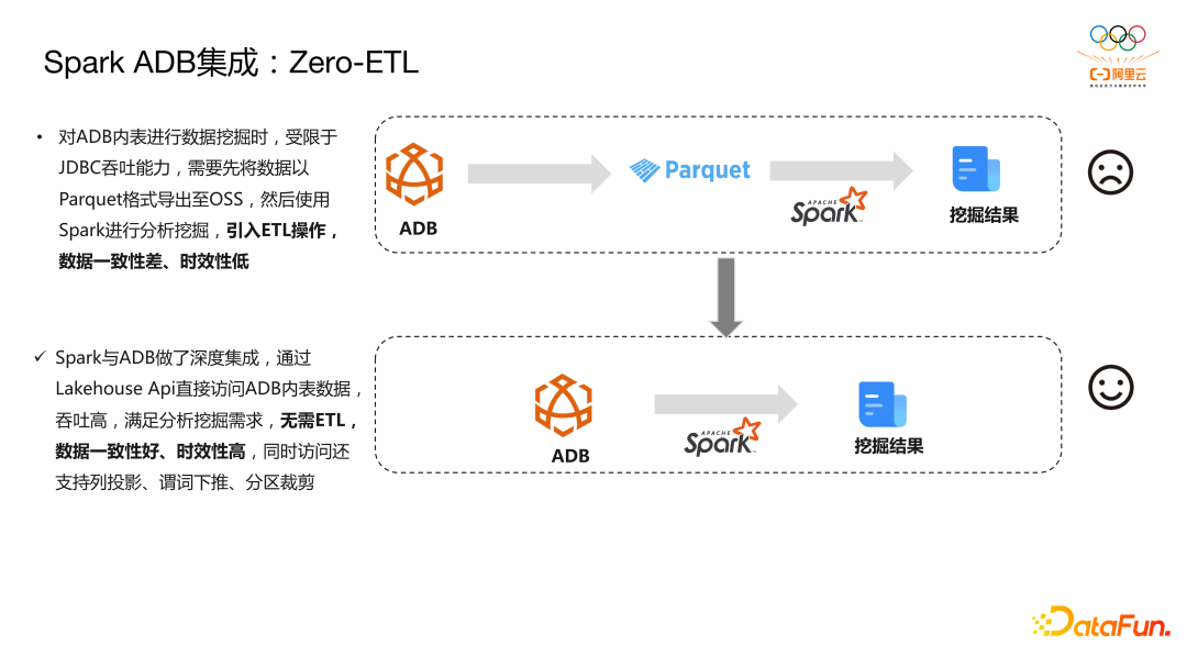 另外最后介绍下 Spark 与 ADB 集成提供的 Zero-ETL 解决方案,这也与 2022 AWS re:Invent 推出的数据集成服务 Zero-ETL 类似,我们通过一个场景了解 Zero-ETL 的应用及其优势。客户如果对于 ADB 表有分析挖掘的需求,受限于 JDBC 方式吞吐的限制,需要先将 ADB内表数据以 parquet 格式导出到 OSS,利用 OSS 的带宽,再通过 Spark 进行分析挖掘,最后输出挖掘结果,可以看到这种方案中存在ETL操作,从而引入数据一致性差、时效性低的问题。在 ADB 湖仓版中 Spark 与 ADB 做了深度集成,通过 Lakehouse API直接访问 ADB 内表数据,吞吐高,所以面对同样的场景,可以使用下面的链路,即直接通过 Spark 分析 ADB 数据,无需 ETL,数据一致性好,时效性也很高;另外对于 Lakehouse API 层的访问也支持列投影、谓词下推、分区裁剪等能力,更多下推能力也在持续建设中。