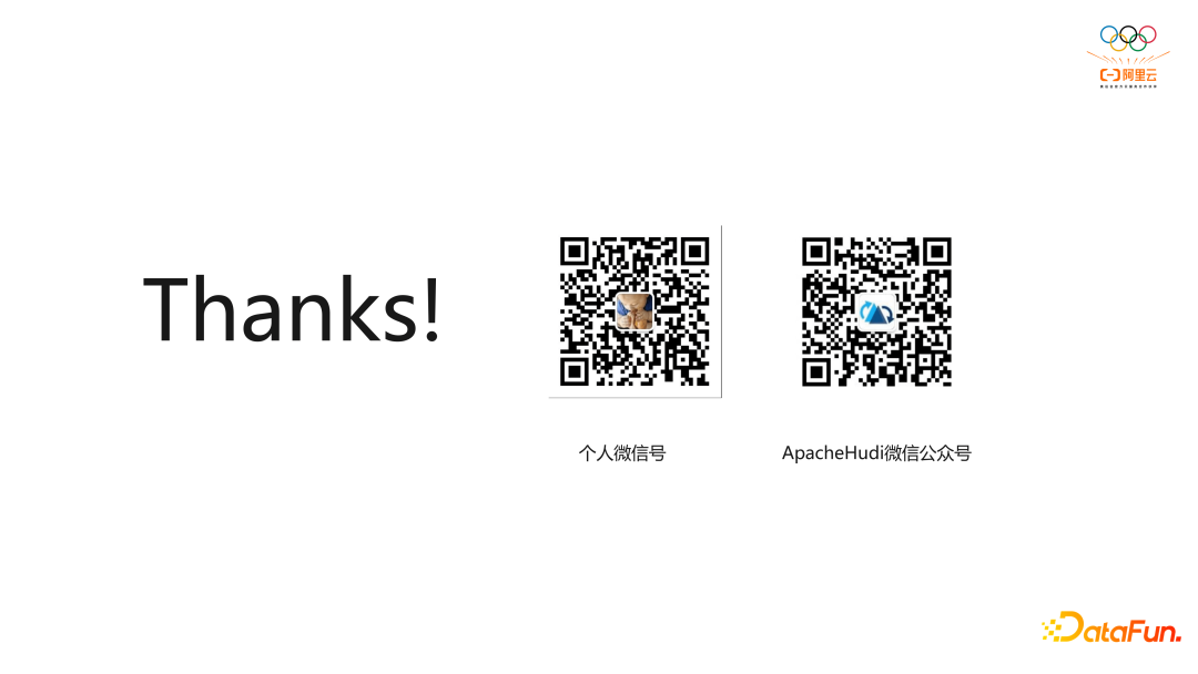 以上便是我今天的分享,大家如果对于 ADB 湖仓版有任何问题欢迎添加我的微信进行技术交流,同时也欢迎大家关注 ApacheHudi 微信公众号,及时接收 Hudi 最新信息,谢谢大家。另外 AnalyticDB MySQL 湖仓版从 7 月份开始,历时 4 个月的邀测后,11 月 1 日正式开始公测,可以通过点击文末「阅读原文」进行公测申请。