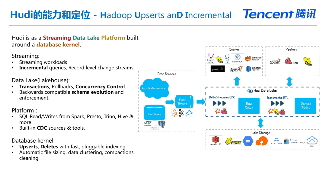 Apache Hudi是一个基于数据库内核的流式数据湖平台,支持流式工作负载,事务,并发控制,Schema演进与约束;同时支持Spark/Presto/Trino/HIve等生态对接,在数据库内核侧支持可插拔索引的更新,删除,同时会自动管理文件大小,数据Clustering,Compaction,Cleanning等