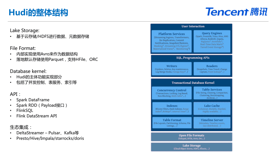 可以基于云存储/HDFS构建基于Hudi的Lakehouse,Hudi支持Parquet、ORC、HFile、avro格式,同时提供了非常丰富的API,如Spark DF、RDD、FlinkSQL、Flink DataStream API,利用这些API可以非常方便地对Hudi表进行操作,同时Hudi也集成了其他生态,如MPP引擎Starrocks,doris等