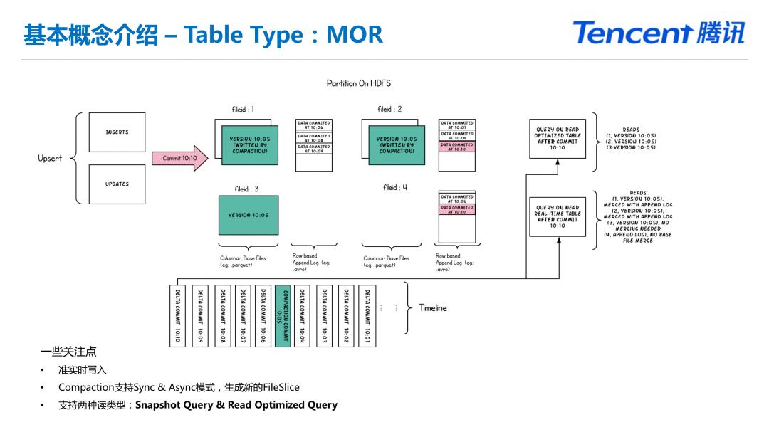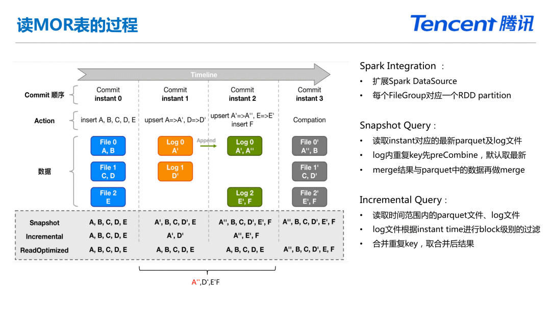 对于MOR表,快照查询(SNAPSHOT Query)读取的是Base文件与Log合并后的最新结果;而增量查询读取指定commit之间的Parquet以及Log文件,然后再对Log文件进行Block级别的过滤(根据Commit时间),合并重复key后返回结果。