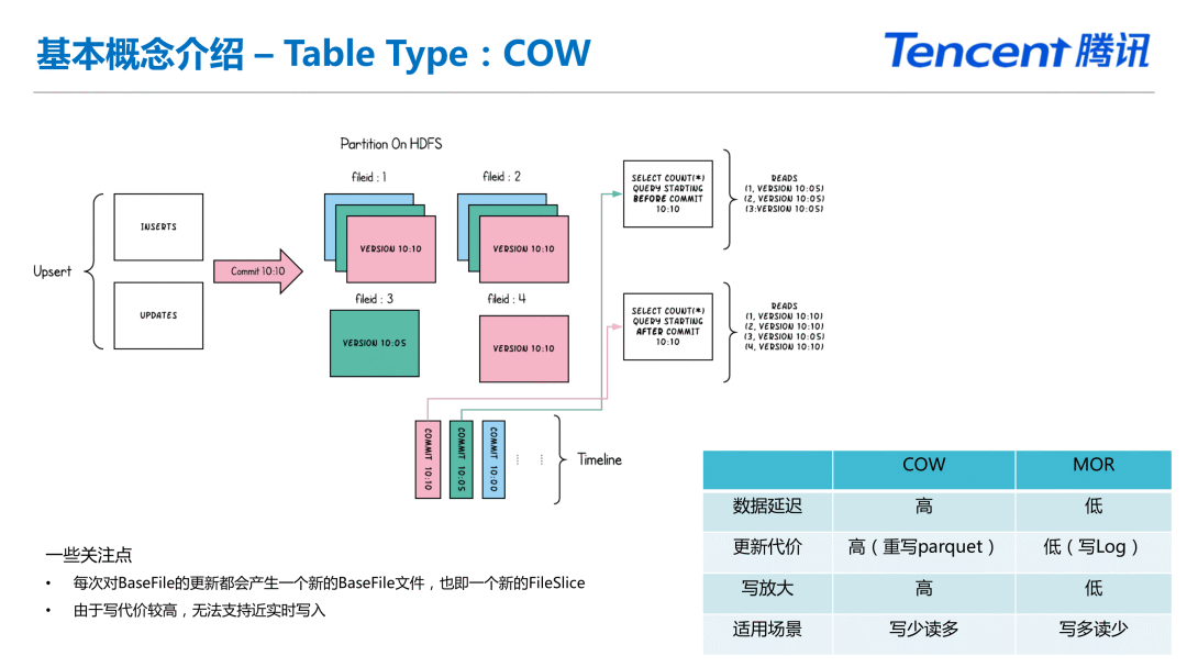 而对于COW表,每次写入需要重写文件,写放大相对严重,延迟相对MOR较高,更适合写少读多的场景。