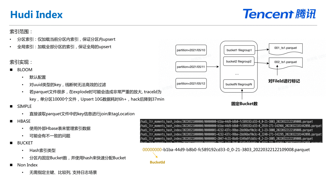 为了加速数据的更新,Hudi支持多种索引,如分区级别的索引以及全表索引,分区级别的索引可以保证数据在分区内的唯一性,全表索引保证数据在表级的唯一性(开销较大)。Hudi支持了多种类型的索引实现,典型的如BLOOM、BUCKET索引,以及自定义索引等方式。