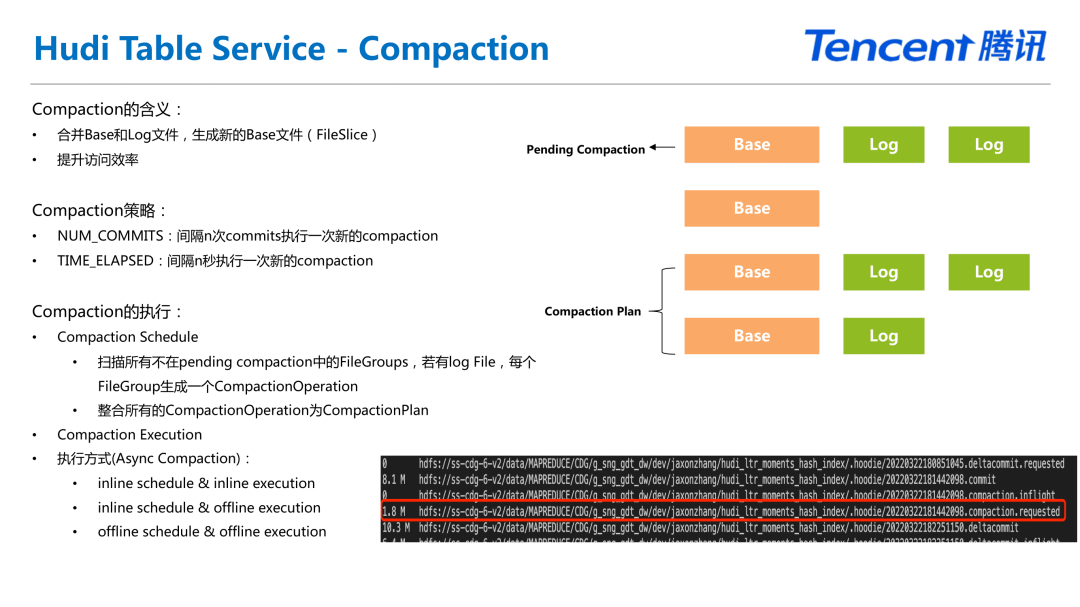 另外一个核心的概念是Hudi的Table Service,包含Compaction操作,Compaction针对FileSlice进行操作,会将Base文件和其对应的Log文件进行合并,产生新的Base文件;可以通过指定NUM_COMMITS或TIME_ELAPSED两种策略调度执行Compaction,对于调度执行而言,Hudi为不影响主链路的写入,支持了异步调度与执行,以及同步调度与执行,同步调度异步执行方式,满足不同的需求。