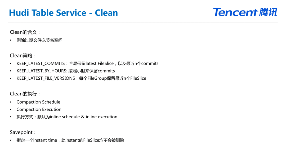 另外一个Table Service是Clean,Clean用于删除过期的文件,同样与Compaction类型也提供了多种策略以及调度执行策略,值得注意的是对于做了Savepoint的时间点,其对应的文件不会被删除。