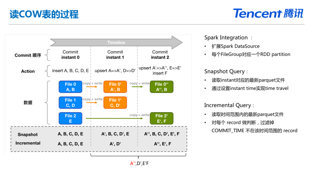 接下来分析对于COW表的不同查询的实现,如在instant 0 时刻写入一部分数据(ABCDE),在instant 1时刻更新A -> A',D -> D',在instant 2时刻更新A' -> A'',E -> E',并插入F 那么对于快照查询(Snapshot Query)每次都是读取的最新的FileSlice,增量查询(Incremental Query)读取指定commit之间的Parquet文件,然后再将时间范围下推至Parquet文件进行过滤,只读取符合条件的变更的数据。