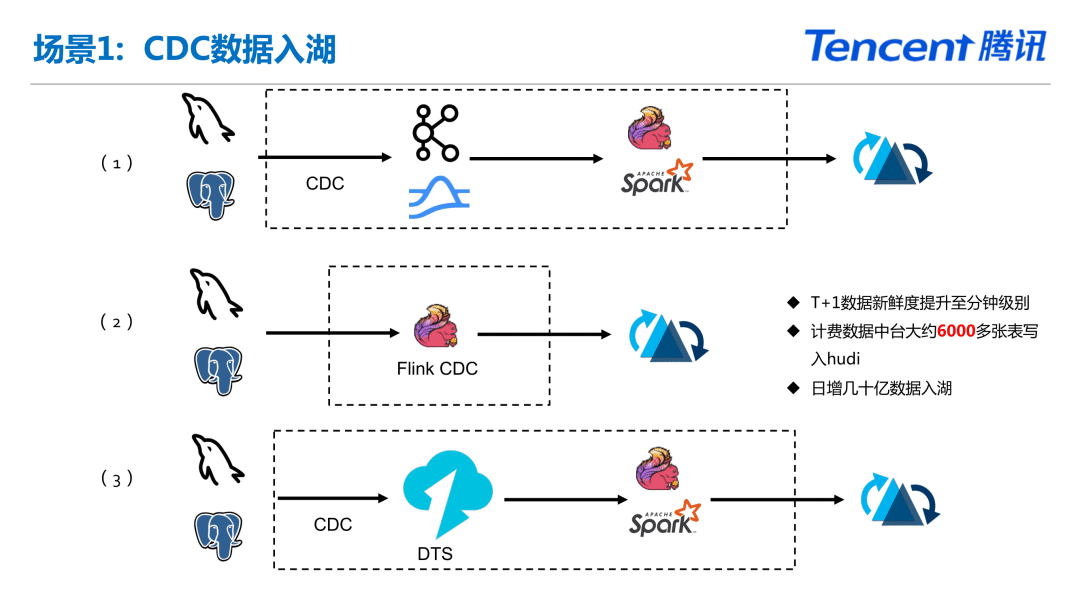 这个场景主要是DB数据入湖入仓把原来T + 1的数据新鲜度提升到分钟级别。数据新鲜度通过目前比较火的以Debezium、Maxwell为代表的CDC(change Data Capture)技术实现。以Streaming近实时的方式同步到数仓里面。在传统的Hive数仓中想保证实时是非常困难的,尤其是文件更新,湖表实时写入更新,基本不可能实现。