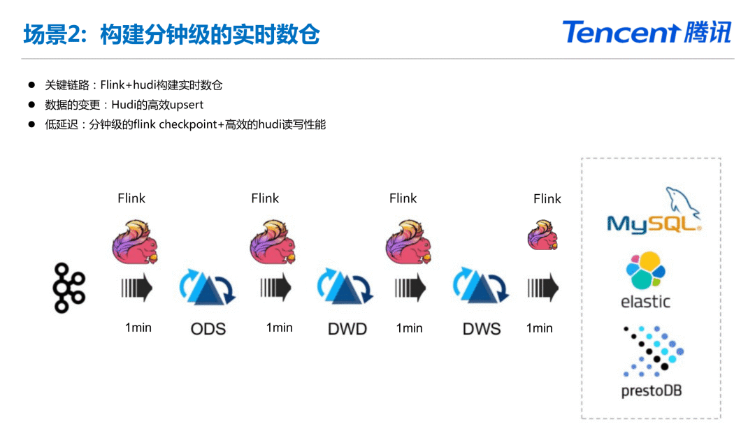 第二个场景是构造分钟级别的实时数仓,分钟级别的端到端数据新鲜度,同时又非常开放的OLAP查询引擎可以适配。其实是对kappa架构或者是原先Streaming数仓架构的一套新解法。在没有这套架构之前,实时分析会跳过Hudi直接把数据双写到OLAP系统中,比如ClickHouse、ES、MongoDB等。当仓存储已经可以支持高效率分级别更新,能够对接OLAP引擎,那么这套架构就被大大简化,首先不用双写,一份数据就可以保证only one truth语义,避免双写带来数据完整性的问题。其次因为湖格式本身是非常开放的,在查询端引擎可以有更多选择,比如Hudi就支持Presto、trino、Spark、Starrocks、以及云厂商的redshift引擎,会有非常高的灵活度。多层数层数据可见性也从T+1 小时或天缩短到分钟级别。