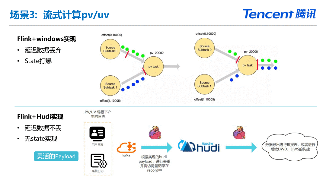 Apache Hudi 的Payload是一种可扩展的数据处理机制,通过不同的Payload我们可以实现复杂场景的定制化数据写入方式,大大增加了数据处理的灵活性。Hudi Payload在写入和读取Hudi表时对数据进行去重、过滤、合并等操作的工具类,通过使用参数 "hoodie.datasource.write.payload.class"指定我们需要使用的Payload class。为了实现pv/uv计算,我们实现了 RecordCountAvroPayload ,它可以在对数据去重的时候,将重复数据的数量记录下来,这里的重复指的是HoodieKey(primary key + partition path)相同。以往处理方式是通过flink + window 聚合实现,该方式有延迟数据丢弃和state爆掉风险,Hudi Payload机制则没有这些风险。