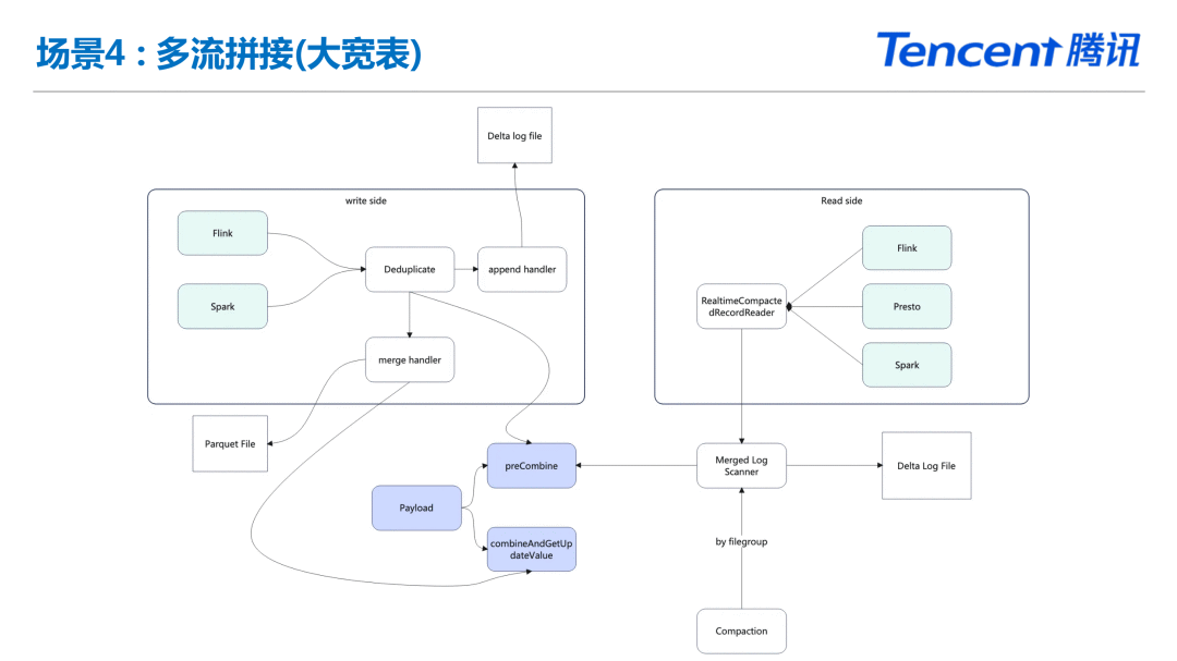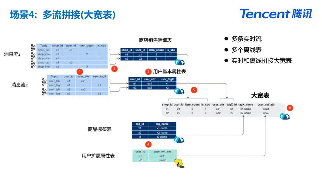 上图是一个典型的非常复杂的业务落地, 消息流1由kafka写入hudi商品销售明细表,消息流2由kafka写入hudi用户基本属性表,然后结合hudi商品标签表和hive用户扩展属性表进行实时和离线拼接大宽表。