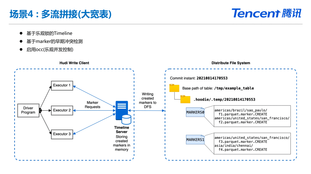 这里主要描述基于时间线服务器的标记机制,该机制优化了存储标记的相关延迟。Hudi 中的时间线服务器用作提供文件系统和时间线视图。如下图所示,新的基于时间线服务器的标记机制将标记创建和其他标记相关操作从各个执行器委托给时间线服务器进行集中处理。时间线服务器在内存中为相应的标记请求维护创建的标记,时间线服务器通过定期将内存标记刷新到存储中有限数量的底层文件来实现一致性。通过这种方式,即使数据文件数量庞大,也可以显着减少与标记相关的实际文件操作次数和延迟,从而提高写入性能。