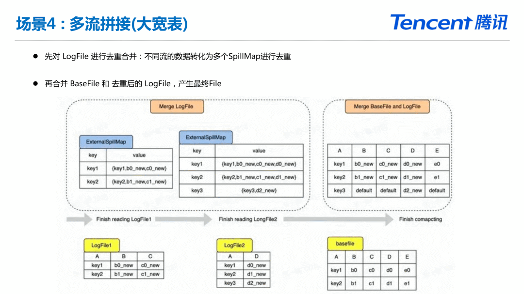 • 在多流拼接中,因为 LogFile 中存在不同数据流写入的数据,即每条数据的列可能不相同,所以在更新的时候需要判断相同 Key 的两个 Record 是否来自同一个流,是则做更新,不是则做拼接。如图 3 所示,读到 LogFile2 中的主键是 key1 的 Record 时,key1 对应的 Record 在 Map 中已经存在,但这两个 Record 来自不同流,则需要拼接形成一条新的 Record (key1,b0_new,c0_new,d0_new) 放入 Map 中。