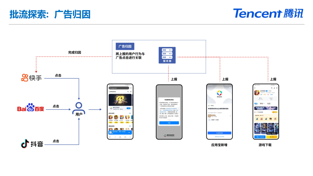 广告归因是指在用户在广告行为链路中,使用科学的匹配模型两两匹配各环节的行为数据点,可用于判断用户从何渠道下载应用(或打开小程序),通过匹配用户广告行为,分析是何原因促使用户产生转化。广告归因的数据结果是衡量广告效果、评估渠道质量的重要依据,可帮助广告主合理优化广告素材,高效开展拉新、促活营销推广,而实时广告归因则能更及时的应用到优化广告投放的过程中。