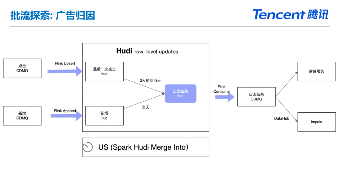 • 批处理三,Super SQL读Hudi新增表(当日)、Hudi点击表(近N天)关联,通过Merge Into语法(row-level update)写入归因结果Hudi表。Super SQL底层计算引擎是Spark3,该任务通过US系统每10分钟调度一次。