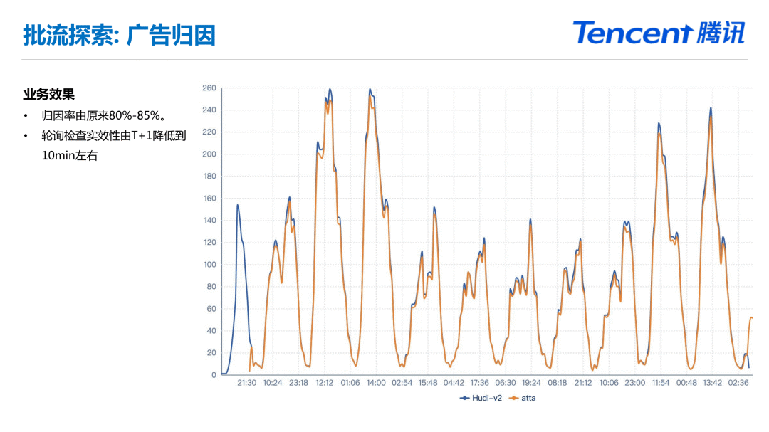 • 准实时和离线数据统一存储,归因率和T+1保持一致,Hudi归因率从原来的80%提升至 85%。