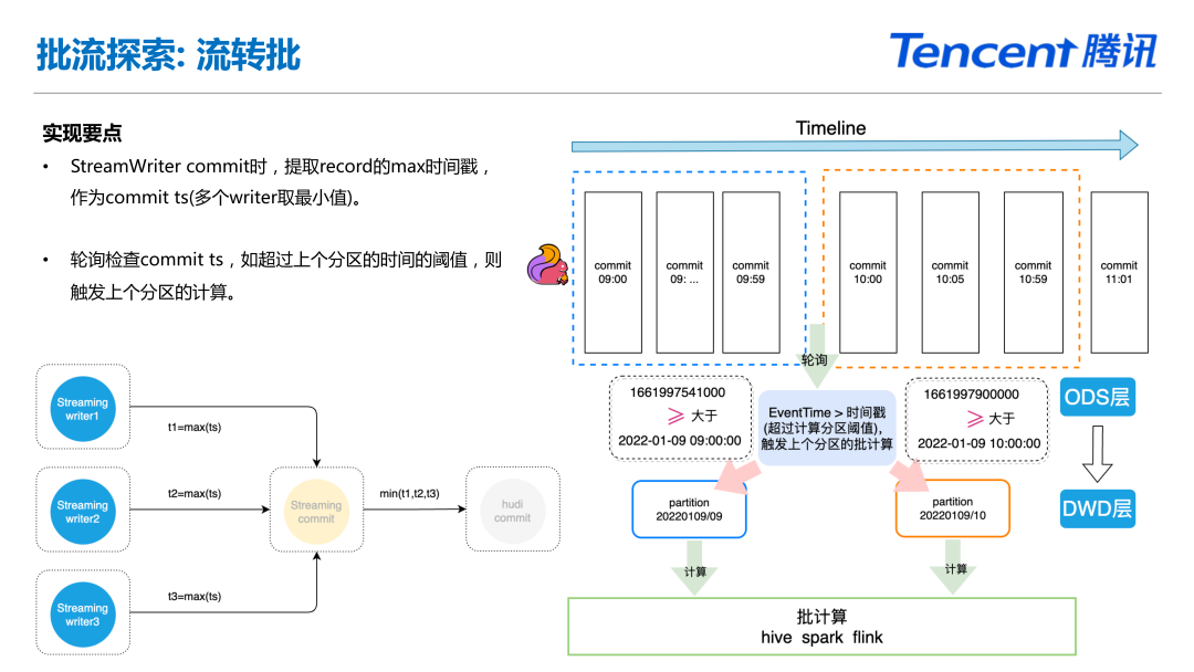 我们的方案是将这个进度值(EventTime)存储为 hudi 提交(版本)元数据的属性里,然后通过访问这个元数据属性获取这个进度值。在下游的批处理任务之前加一个监控任务去监控最新快照元数据。如果它的时间已经超过了当前的分区时间,就认为这个表的数据已经完备了,这个监控任务就会成功触发下游的批处理任务进行计算,这样可以防止在异常场景下数据管道或者批处理任务空跑的情况。